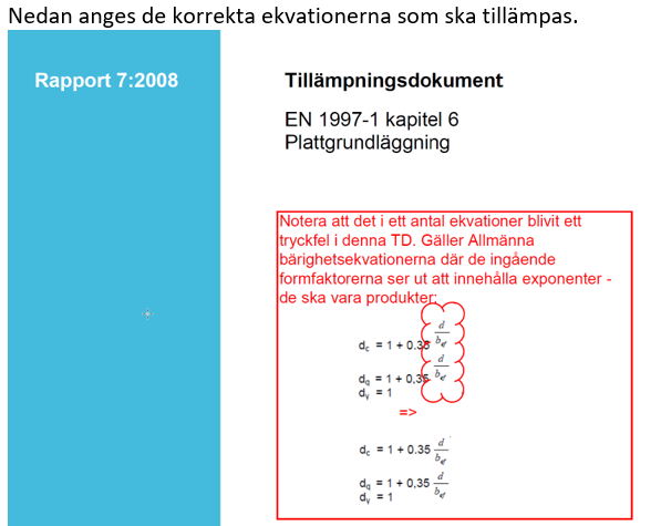Fråga: Vid beräkning av grundtryckets dimensionerande brottvärde med allmänna bärighetsekvationen har SS-EN 1997-1 kommit med ett exempel i Bilaga D till standarden. EKS har kommenterat bilagan enligt följande: "50 § Bilaga D behåller, under förutsättning att inverkan av grundläggningsnivå, hållfasthet över grundläggningsnivå samt lutande intilliggande markyta beaktas, sin informativa karaktär vid nationell tillämpning. (BFS 2015:6)". Implementeringskommission för Europastandarder inom Geoteknik har i IEG Rapport 7:2008 kommit med ett exempel i Bilaga C.3 till rapport. Samma metodik som i Bilaga D till standarden används. Däremot skiljer sig några ekvationer åt, som till exempel ekvationerna för bärighetsfaktorer och korrigeringsfaktorer för fundamentform. Ska man följa IEGs ekvationer eller är det ändå standard som gäller?